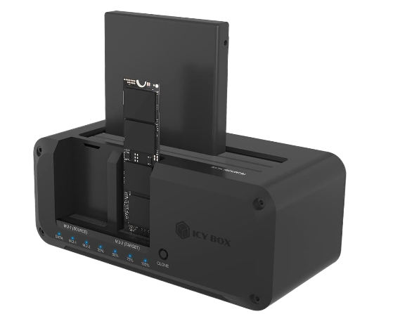 Die ICY BOX IB-2924MSCL-C31 ist eine Docking- und Klonstation für 2,5″/3,5″ SATA-Laufwerke und M.2-NVMe-SSDs.